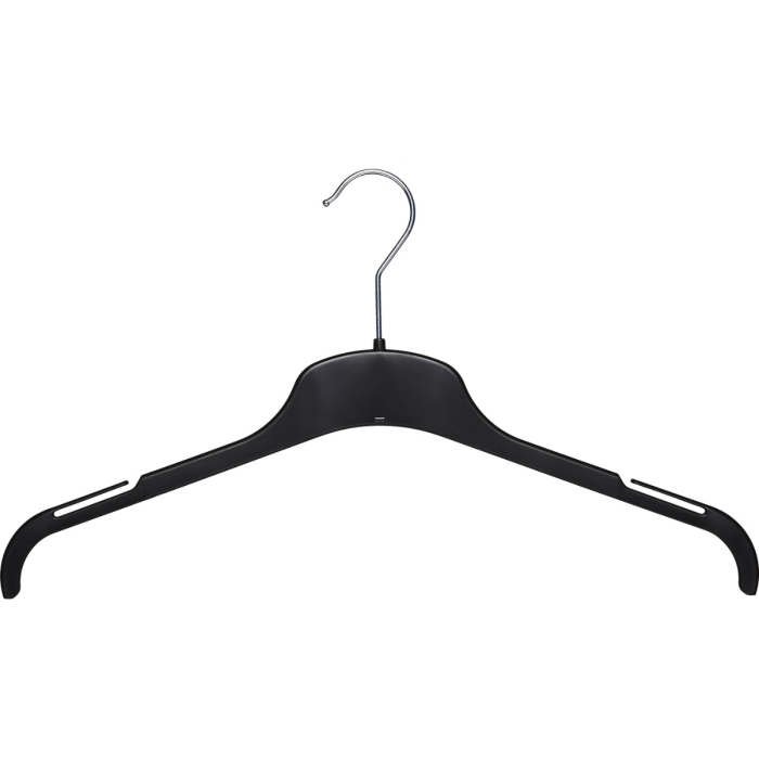 Kleiderbügel TU 47 schwarz ✓ Kunststoffbügel in schwarz ✓ verzinkter und drehbarer Haken ✓ Wäschebügel aus Kunststoff ✓ mit Rockhaken an der Oberseite ✓ die Auflagenbreite beträgt 10 mm ✓ erhältlich in einer Breite von 47 cm