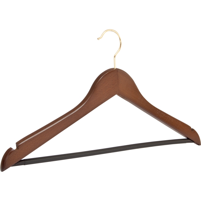 Kleiderbügel 139 HR nuss ✓ Buchenholz nuss gebeizt ✓ vermessingter Kugelhaken, drehbar ✓ erhältlich in der Breite 44 cm ✓ die Auflagebreite beträgt 13 mm ✓ mit rutschfest ummantelten Steg ✓ mit zwei Rockeinkerbungen ✓ auch für den Hotelbetrieb geeignet