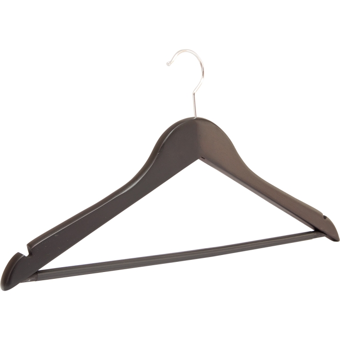 Kleiderbügel 139 HR wenge ✓ Buchenholz wenge gebeizt ✓ vernickelter Kugelhaken, drehbar ✓ erhältlich in der Breite 44 cm ✓ die Auflagebreite beträgt 13 mm ✓ mit rutschfest ummantelten Steg ✓ mit zwei Rockeinkerbungen ✓ auch für den Hotelbetrieb geeignet