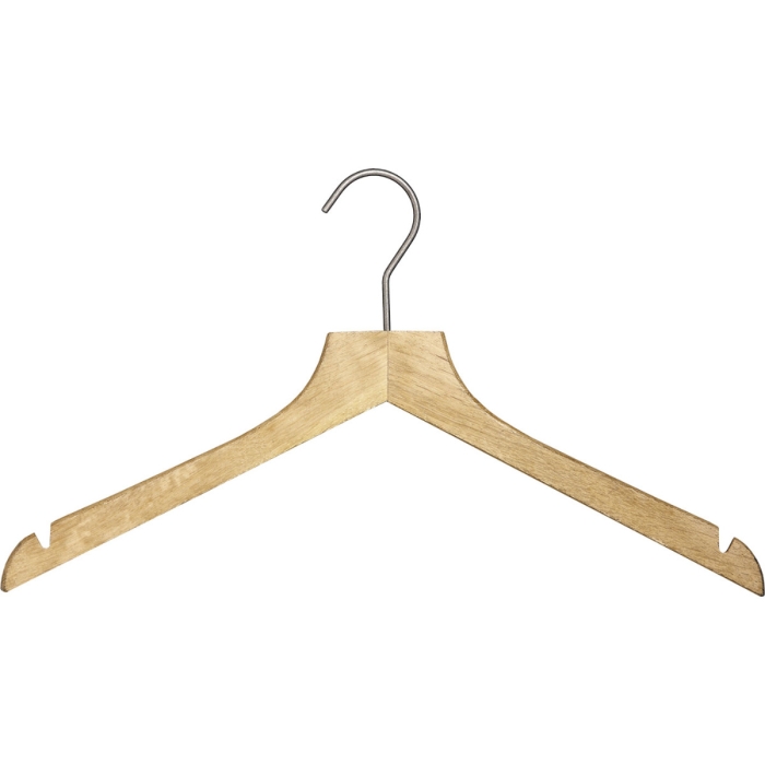 Kleiderbügel 149 Vintage ✓ Eichenholz im Vintage-Look ✓ 4 mm Haken, matt ✓ Eichenholz, roh im Vintage-Look ✓ erhältlich in den Breite von 44 cm ✓ die Auflagebreite beträgt 12 mm ✓ Flachbügel mit Rockeinkerbungen
