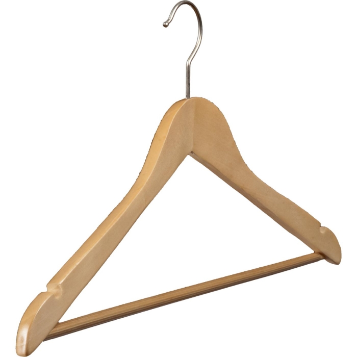 Kleiderbügel C339 HR ✓ Lotusholz natur lackiert ✓ gewinkelter Formbügel ✓ in der Farbe natur lackiert ✓ mit Rockkerben an den Seiten ✓ vernickelter Kugelhaken, drehbar ✓ die Bügelbreite beträgt 43 cm ✓ die Auflagebreite beträgt 13 mm ✓ mit Steg, rutschfest ummantelt ✓ besonders leicht, da aus Lotusholz
