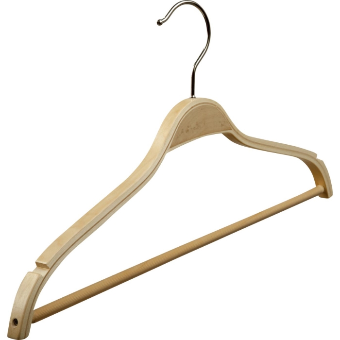 Kleiderbügel CL 157 HRT ✓ Schichtholzbügel aus Lotusholz ✓ Kleiderbügel natur lackiert ✓ vernickelter Haken, drehbar ✓ mit integrierten Rockkerben ✓ ansprechendes Design ✓ sehr leicht und platzsparend ✓ mit rutschfestem transparenten Steg ✓ erhältlich in der Breite von 42,5 cm ✓ der Kleiderbügel hat eine Auflagebreite von 10 mm