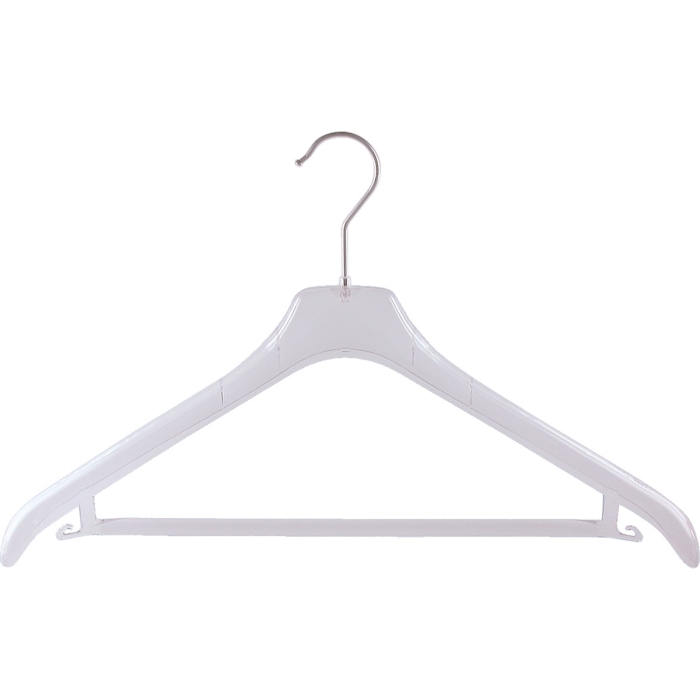 Kleiderbügel F 2 Steg transparent 49 cm ✓ Kunststoffbügel in transparent ✓ verzinkter und drehbarer Haken ✓ die Auflagebreite beträgt 20 mm ✓ nach CCG Richtlinien hergestellt ✓ erhältlich in einer Breite von 49 cm ✓ in klarglas Optik mit Rockhäkchen und Steg ✓ die Gesamthöhe des Bügels beträgt 30 cm