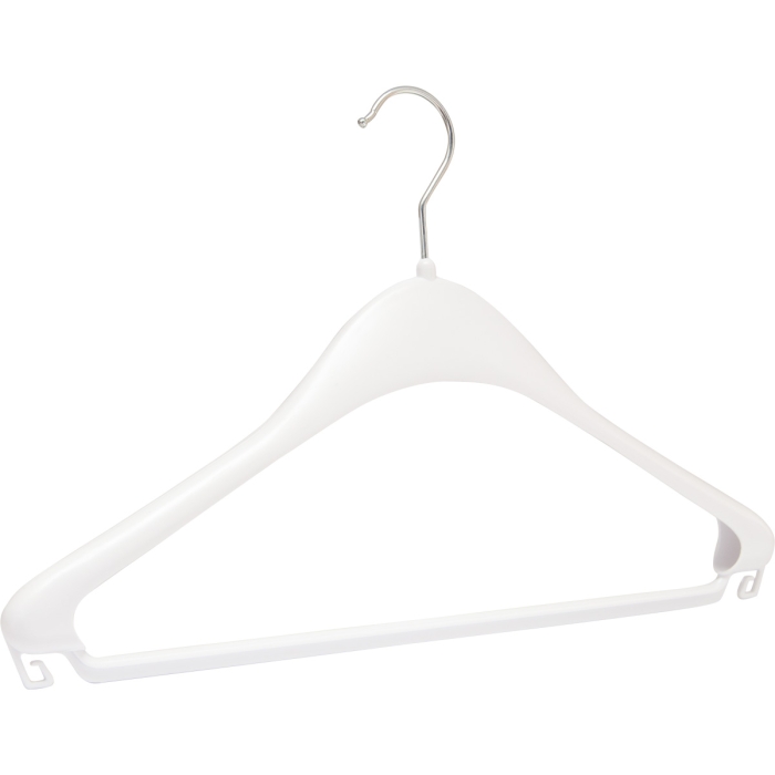 Kleiderbügel F 44 weiß ✓ mit Steg und Rockhäkchen ✓ verzinkter und drehbarer Haken ✓ Universalbügel leicht gewölbt ✓ die Auflagebreite beträgt 23 mm ✓ die Kleiderbügelbreite beträgt 44 cm ✓ auch in schwarz, grau und weiß erhältlich