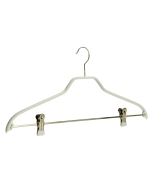 Kleiderbügel Mawa Silhouette FK weiß - die Auflagenbreite beträgt 10 mm - integrierter Steg mit zwei Clips - der Kleiderbügel ist plangeformt - mit drehbarem Haken, vernickelt - Spitzenqualität "Made in Germany" - ganzflächig rutschhemmend ummantelt - in der Farbe weiß erhältlich - die Kleidebügelbreite beträgt 45 cm
