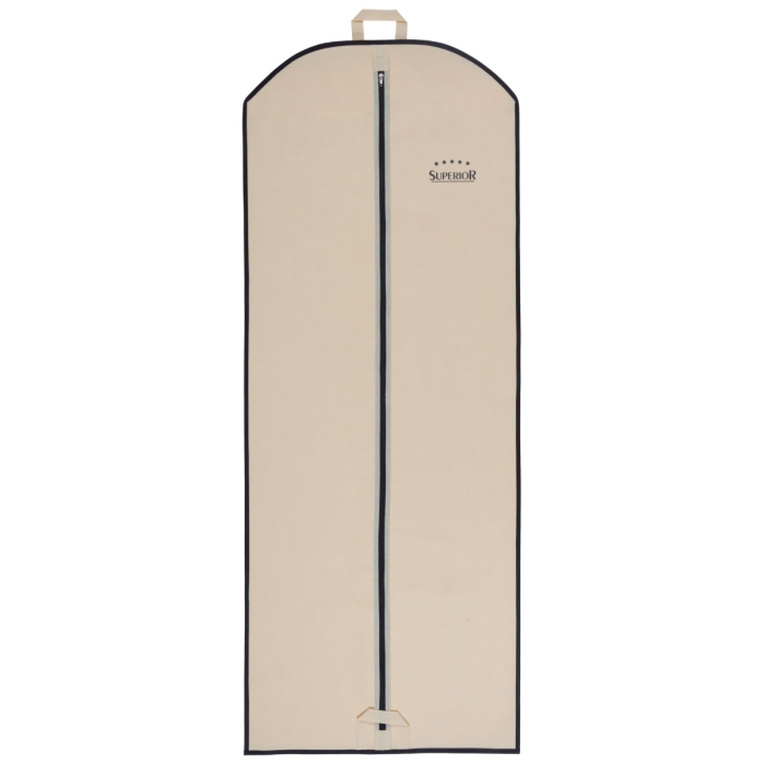 Kleidersack SUPERIOR beige ✓ atmungsaktive und abriebfest ✓ Material Vliesstoff (PP, non-woven, 80 g/qm) ✓ zwei Schlaufen für einfachen Transport ✓ mit mittigem Metall-Reißverschluss ✓ Größe 60 cm x 150 cm ✓ inkl. Aufdruck Superior auf der Vorderseite ✓ zur staubfreien Aufbewahrung von Textilien ✓ außen strukturiert, innen glatte Oberfläche ✓ mit Schlaufe an der Ober- und Unterseite