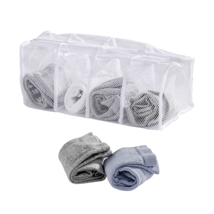 Das Socken-Wäschenetz schützt ihre Socken und Strümpfe während dem Waschen, Spülen und Schleudern. In 4 Fächern können die Socken schon vor dem Waschen sortiert werden und durch das kochfeste Textilgewebe und besonders grobe Maschen, welche optimalen Wasseraustausch garantieren, werden sie während des Waschvorgangs bestens geschützt und gereinigt. Verschließbar mit einem Reißverschluss.