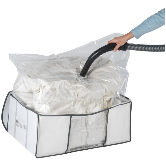 VVakuum Soft Box L ✓ einfaches Absaugen mit Staubsauger ✓ Maße der Box: 65 cm x 50 cm x 27 cm ✓ mit Luftventil ausgestattet ✓ langanhaltender staubfreier Schutz ✓ Stoff: 100 % Polypropylen, Folie: Polyethylen ✓ mit Vakuum-Tasche für luftdichtes Verstauen ✓ Maße der Vakumm-Tasche: 110 cm x 100 cm x 44 cm ✓ bis zu 75 % Platzersparnis durch Vakumm komprimierung