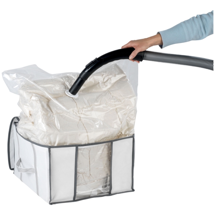 Nach dem Absaugen bleibt der Inhalt sicher und geschützt vor Staub und Luft. Bei Bedarf lässt sich die Box einfach öffnen, und die Kleidungsstücke sind sofort griffbereit.