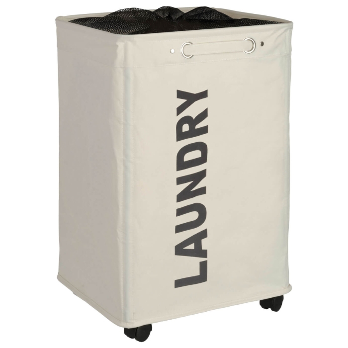 Wäschesammler Quadro beige ✓ das Fassungsvermögen beträgt 79 Liter ✓ Maße ca. (B x H x T): 40 x 60 x 33 cm ✓ mit Sichtschutzabdeckung für Schmutzwäsche ✓ mit 4 leichtgängigen Rollen, flexibel verstellbar ✓ aus 100 % Polyester, Rollen: Polypropylen ✓ mit praktischem Tragegriffen an der Vorderseite ✓ Farbe beige, Rollen: Schwarz, Verstärkungsstreben: Schwarz