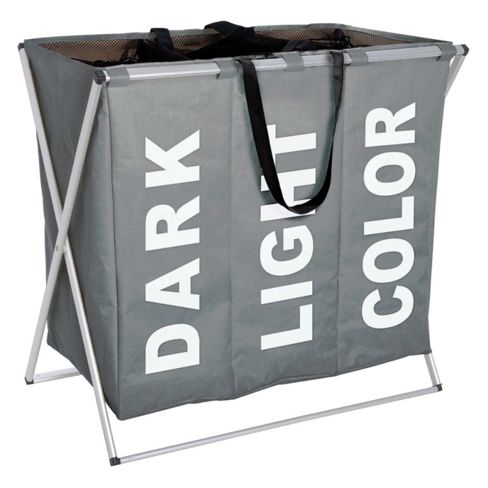 Der moderne Wäschesammler Trio in elegantem, trendigem grau bringt Stil ins Bade- oder Schlafzimmer. Er bietet jede Menge Platz für die Wäsche bis zum nächsten Waschgang. Durch die drei praktischen Fächer mit je 43 Litern Fassungsvermögen kann die Wäsche vorab ganz einfach nach Farben oder Temperatur getrennt werden. Der Wäschekorb ist aus hochwertigem, strapazierfähigem Polyestergewebe gefertigt. Die stabilen Trageriemen eignen sich zum bequemen Transport der Wäsche. Bei Nichtgebrauch kann der Sammler zusammengefaltet und platzsparend aufbewahrt werden.