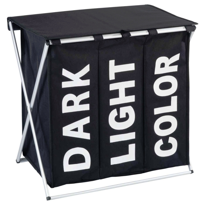 Der elegante Wäschesammler Trio Top schwarz überzeugt durch seine hochwertige Aufmachung und sein großes Fassungsvermögen von insgesamt 118 Litern. Der rechteckige Wäschesammler Trio Top in modischem schwarz ist aus hochwertigem Polyester gefertigt und macht im Badezimmer, Schlafzimmer oder direkt in der Waschküche immer eine gute Figur. Sein Schriftzug macht den Wäschekorb zu einem echten Hingucker. Der Ordnungshelfer ergänzt den Haushalt um ein dekoratives und gleichzeitig praktisches Accessoires mit flexiblen Verwendungsmöglichkeiten. Im Wäschesammler Trio Top findet Wäsche nicht nur viel Platz bis zum nächsten Waschgang sondern kann in drei Fächern vorab getrennt werden, z.B. nach Farben oder Temperatur. Durch den cleveren Deckel wird die unschöne Schmutzwäsche gekonnt versteckt. Die praktischen Tragegriffe sind ein weiteres Highlight des abnehmbaren Wäschekorbs. Das hochwertige Gestell aus Aluminium ist gleichermaßen stabil wie leicht und kann bei Nichtgebrauch einfach platzsparend zusammengefaltet werden.