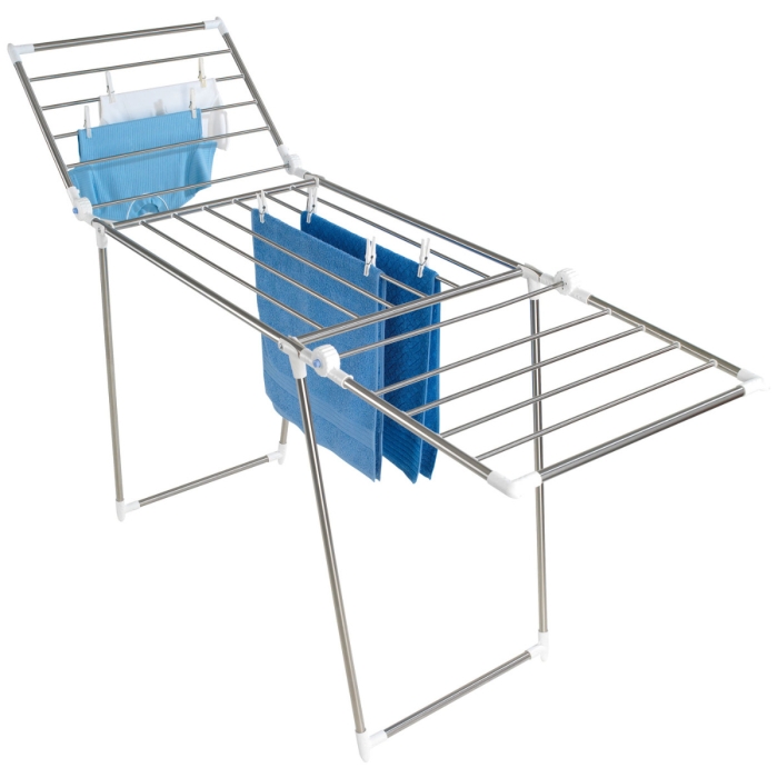 Das praktische Zubehör-Set umfasst 7 Sockenklammern, einen Pullovertrockner, 24 Wäscheklammern sowie einen Klammerbeutel mit Reißverschluss, der sich per Klettverschluss am Wäscheständer befestigen lässt. Mit einem Gewicht von ca. 4120 g ist der Wäscheständer standfest und robust, lässt sich jedoch bei Bedarf einfach platzsparend zusammenklappen.